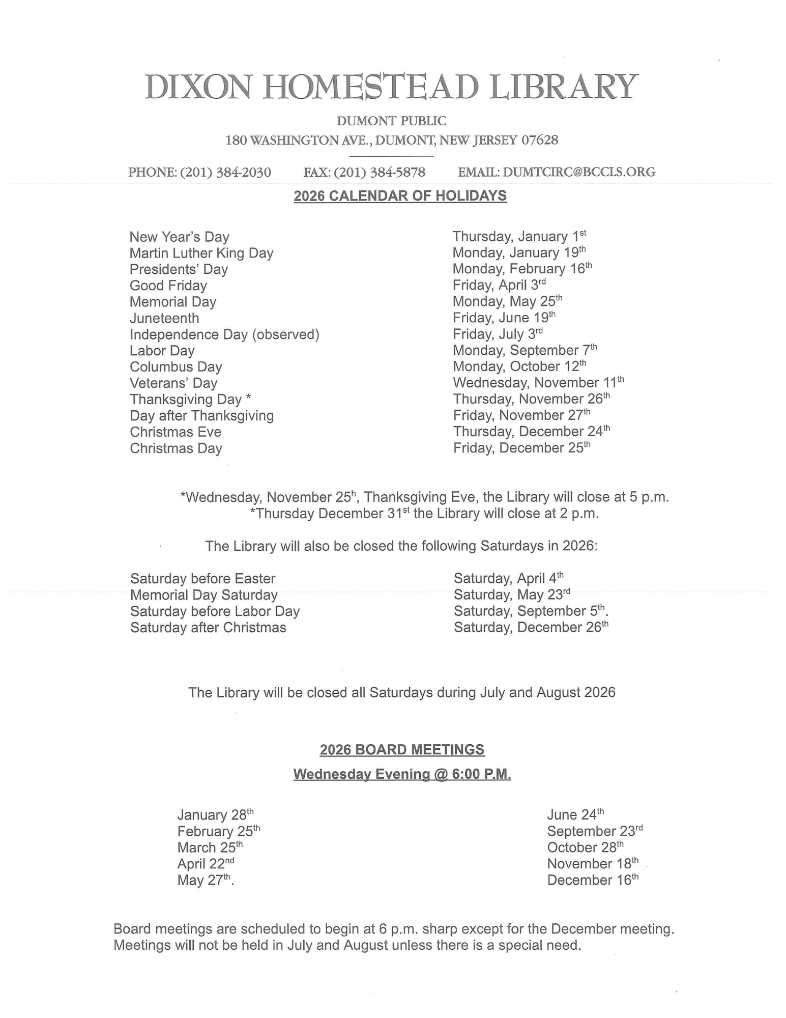 *Wednesday, December 31st, New Year’s Eve, the Library will close at 2 p.m.